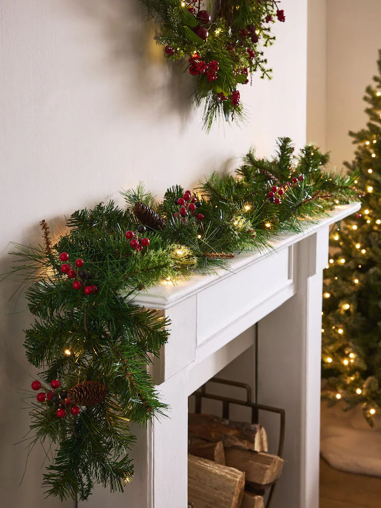 På en hylla eller eldstad framhäver girlangen de små detaljerna i hemmet och binder ihop hela juldekoren med ett mjukt, varmt sken.